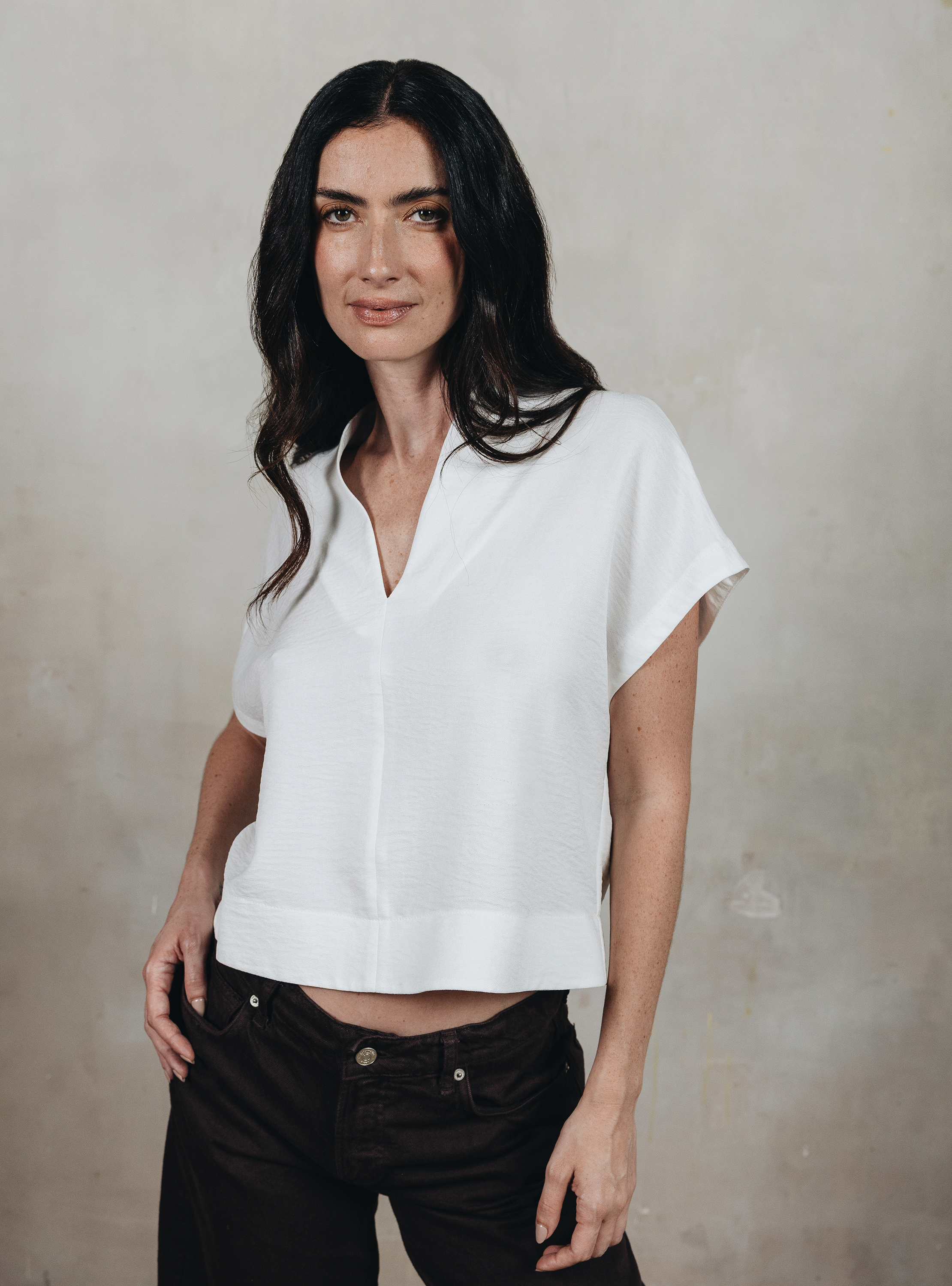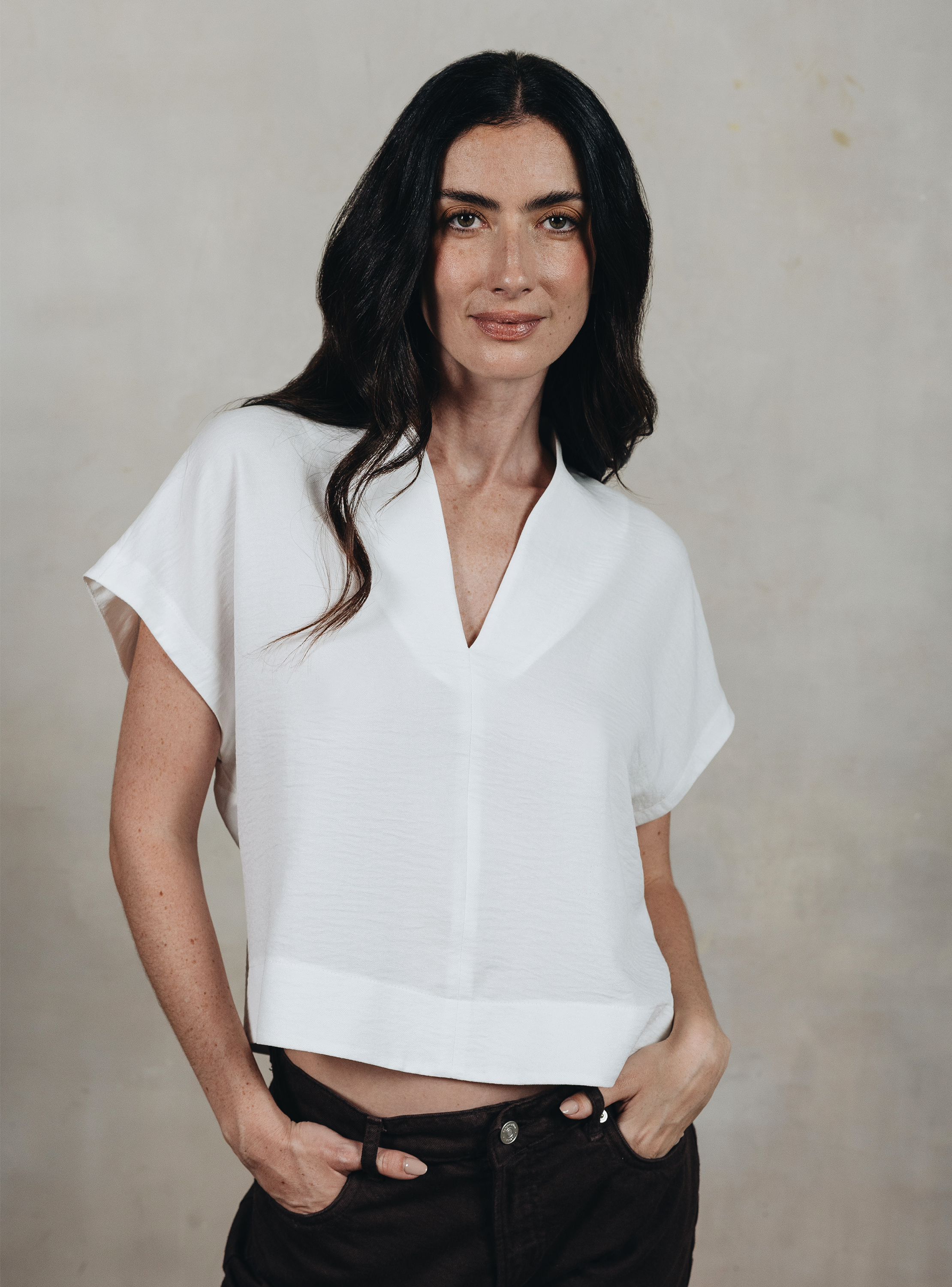 Colección Octavia. Blusa con escote "V", hombro caido y dobladillos anchos. Sólo en Octavia.