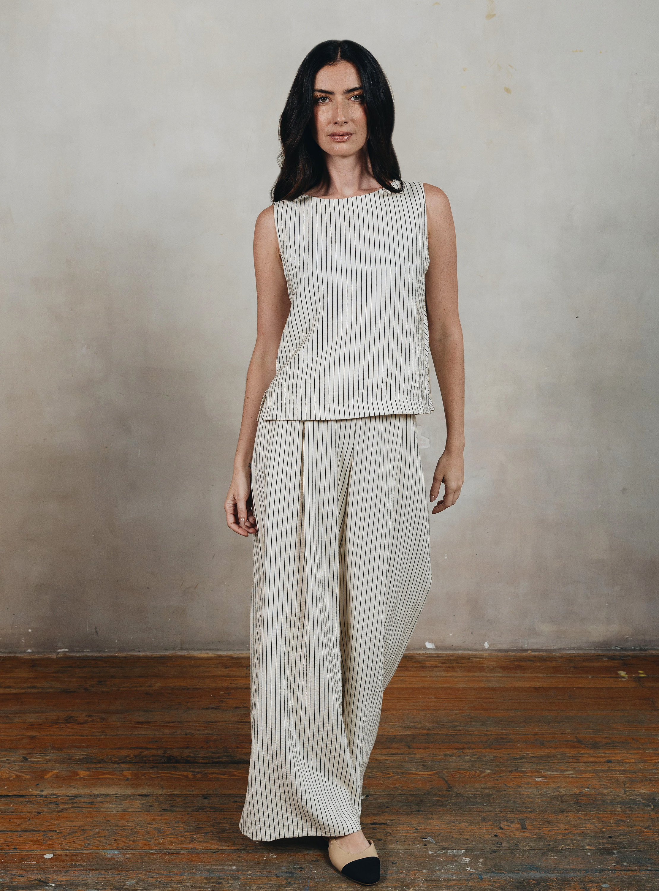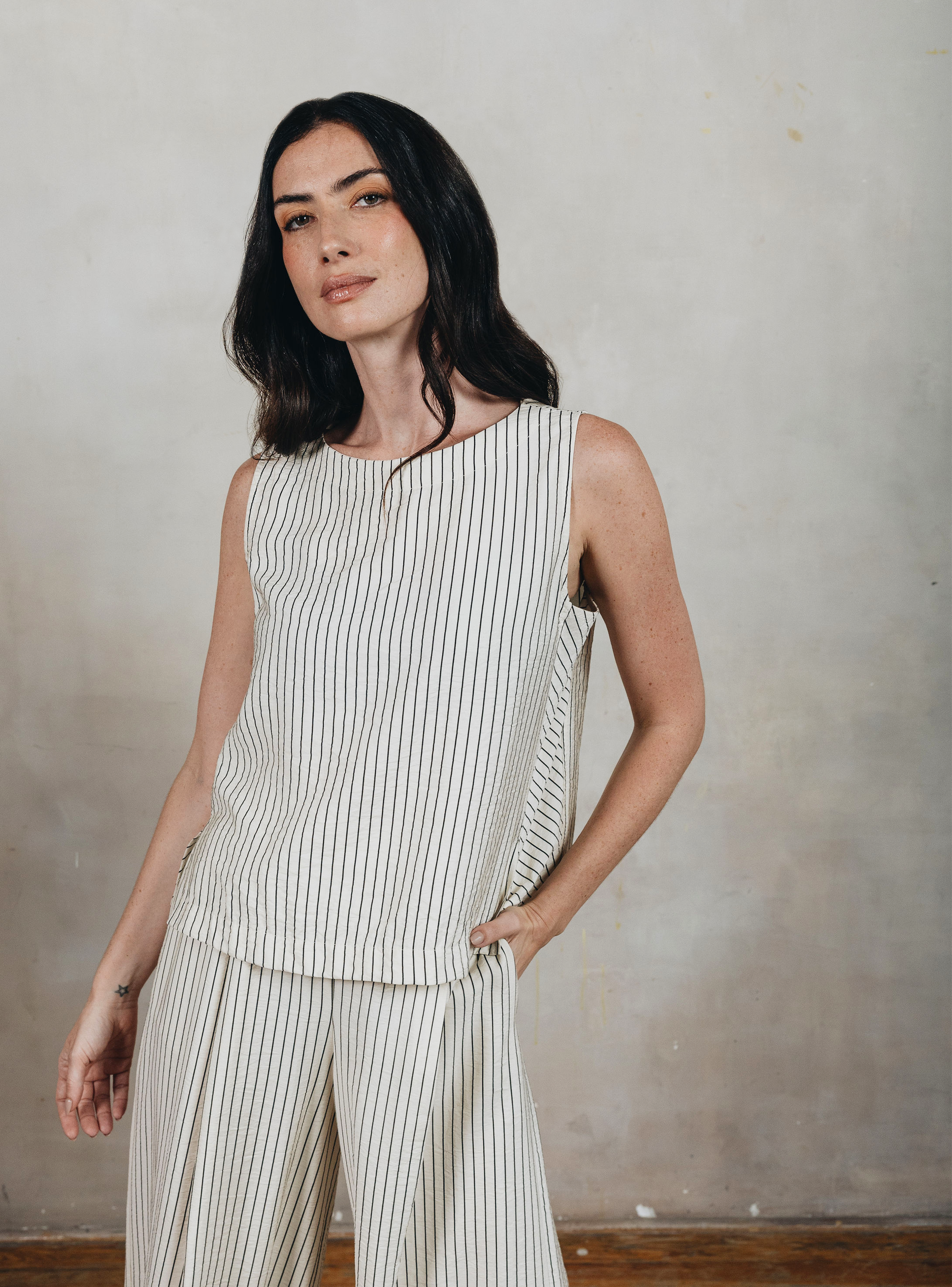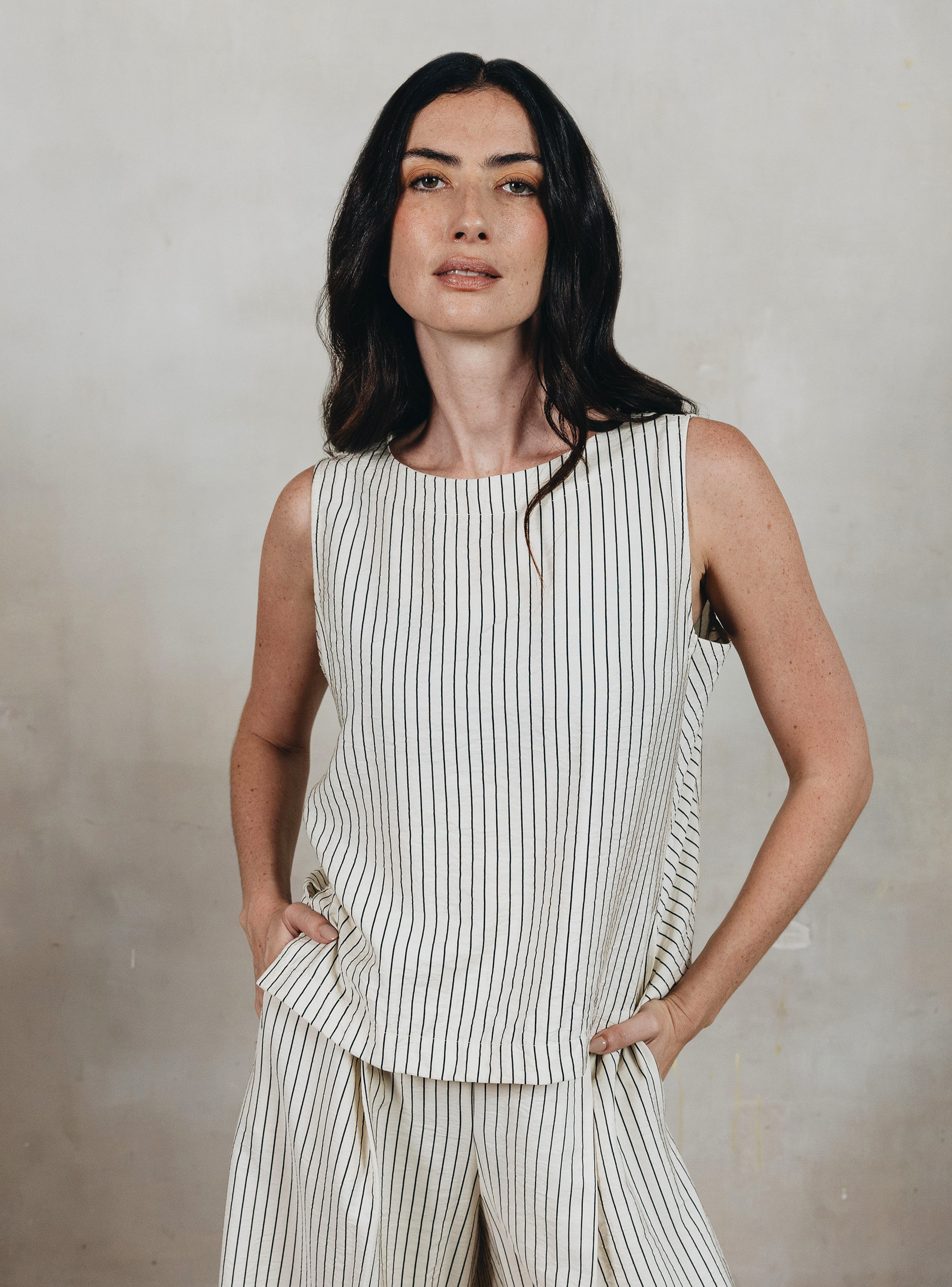 Colección Octavia. Blusa con escote barco, sin mangas, corte en costadillo en contraste y aberturas en costados. Sólo en Octavia.