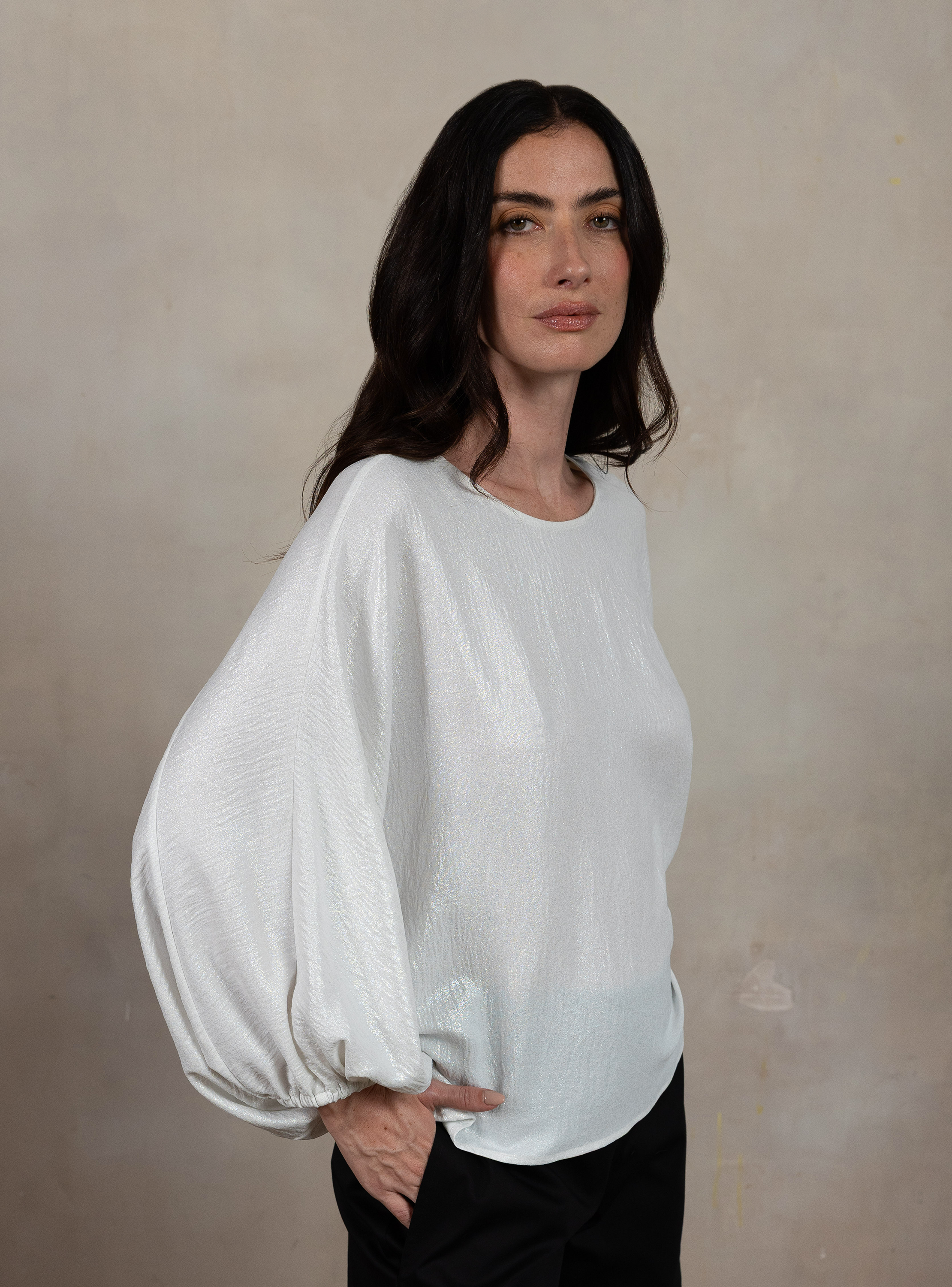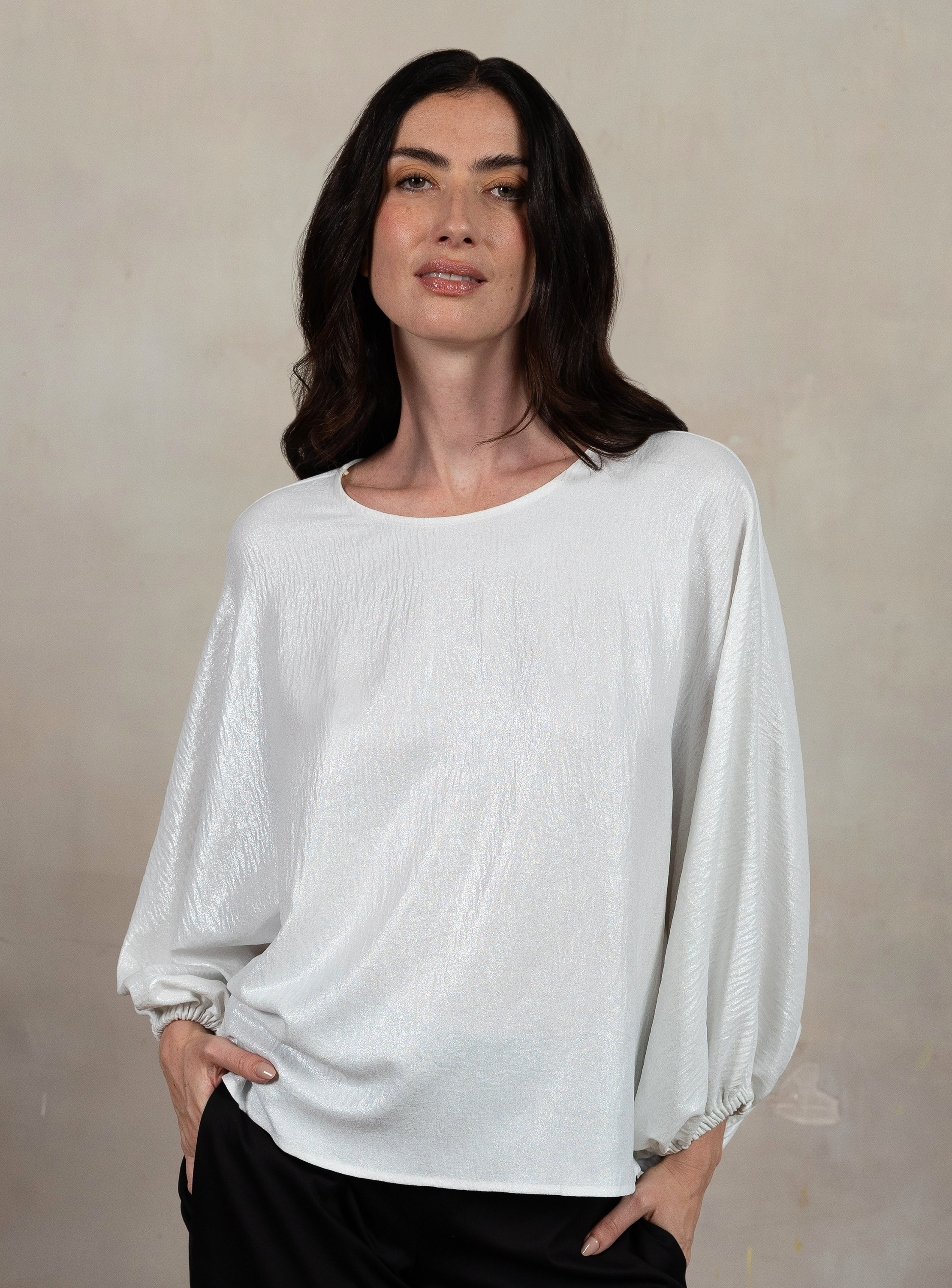 Colección Octavia. Blusa con con escote redondo, escote de espalda en "V" y manga globo con elástico en puño. Sólo en Octavia.